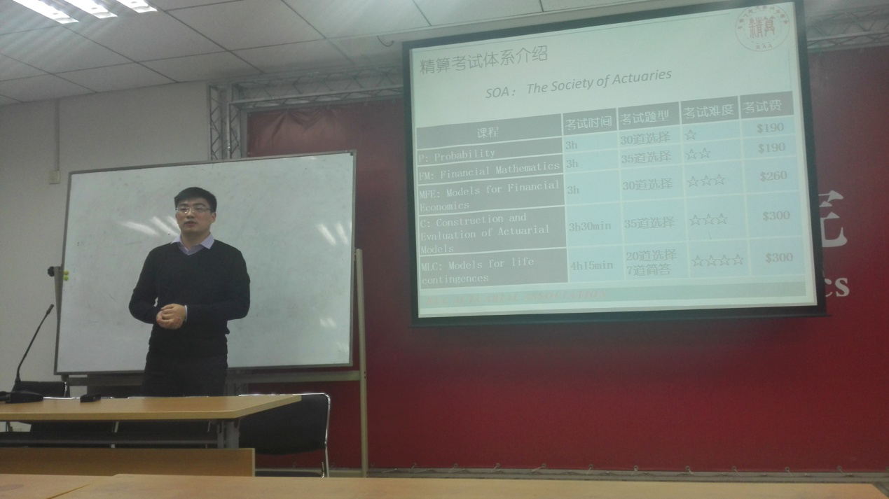 精算学会副主席余韬依据自身丰富的精算考试经验和对不同精算考试体系充分的了解,给同学们详细介绍了精算考试的体系,主要讲述了国内精算领域认可度较高的三大考试体系——北美寿险精算协会(SOA),中国精算师协会(CAA),英国精算协会(FIA)。并主要就SOA详细介绍了其考试体系,报名流程,考试科目(包括主要内容和题型),资格认证条件。此外,余韬同学还介绍了各个科目考试的考试复习经验,为接触精算时间不长的同学提供很多有用的信息,帮助大家对精算考试有了更深入的理解,并能够更有把握地做出抉择。余韬同学还对同学们在报名时提出的问题一一做出了解答。