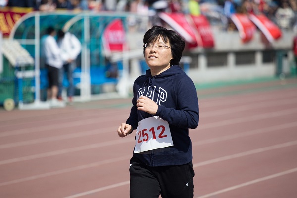 在教职工的赛场上,老师们也在用拼搏与汗水诠释着体育精神,享受着体育的魅力。在女子800米A组决赛中,徐建萍精神饱满、健步如飞,以3分29秒54的好成绩名列第四位。