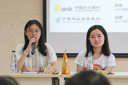 交流会共分为三个部分,首先由各位嘉宾简单介绍自己求职经历,之后在主持人的引导下,各嘉宾分别就选择银行业的初衷、获取银行招聘信息的渠道,以及招聘流程中网申、笔试、面试等各个环节展开分享,最后进入自由提问环节。