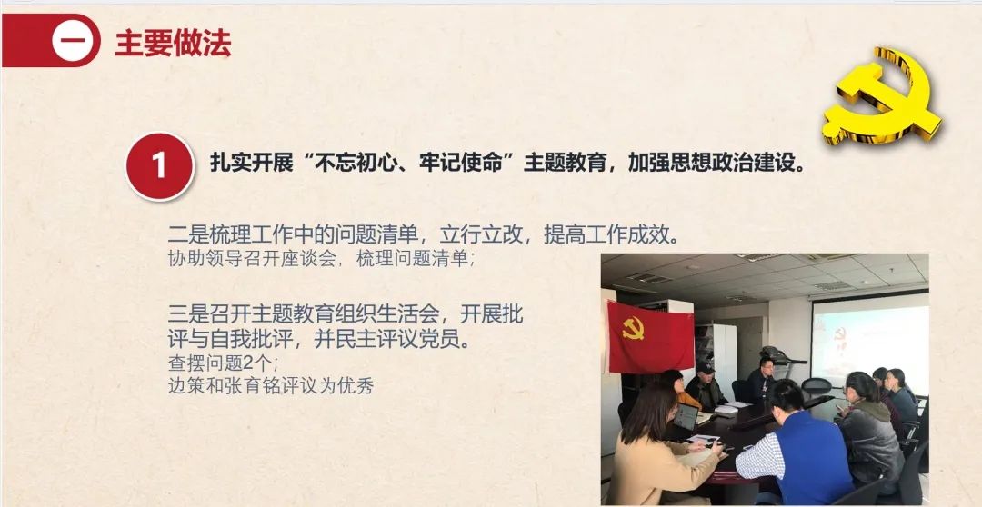 公司各党支部扎实开展“不忘初心、牢记使命”主题教育,聚焦学习贯彻习近平新时代中国特色社会主义思想这条主线,采取集中学习讨论、观看主旋律电影、观看展览等多种形式,圆满完成主题教育学习任务。有的党支部组织学习《中国共产党党章》《习近平新时代中国特色社会主义思想学习纲要》、党的十九届四中全会精神等文件精神,力求学深悟透,提高党员理论水平和政治意识;有的党支部组织党员观看《我和我的祖国》《榜样4》《不忘初心,继续前进》等主旋律影片,感受爱国精神,学习榜样力量;有的党支部组织党员和入党积极分子参观《庆祝建国七十周年成就展》,感受祖国发展的日新月异,激励大家为实现中国梦而努力奋斗。