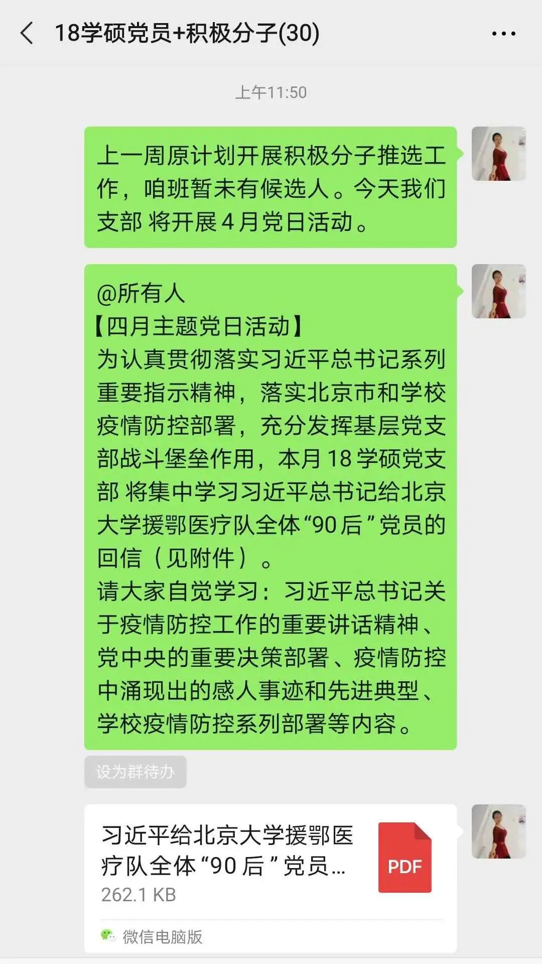 为深入学习贯彻习近平总书记关于疫情防控工作的重要讲话和指示批示精神,学习感悟疫情防控中涌现出的感人事迹和先进典型,2020年4月,公司党委组织各员工党支部开展线上主题党日活动,集中学习《习近平总书记给北京大学援鄂医疗队全体“90后”党员的回信》(以下简称《回信》)和防疫先锋模范事迹,引导员工党员深入开展学习交流。