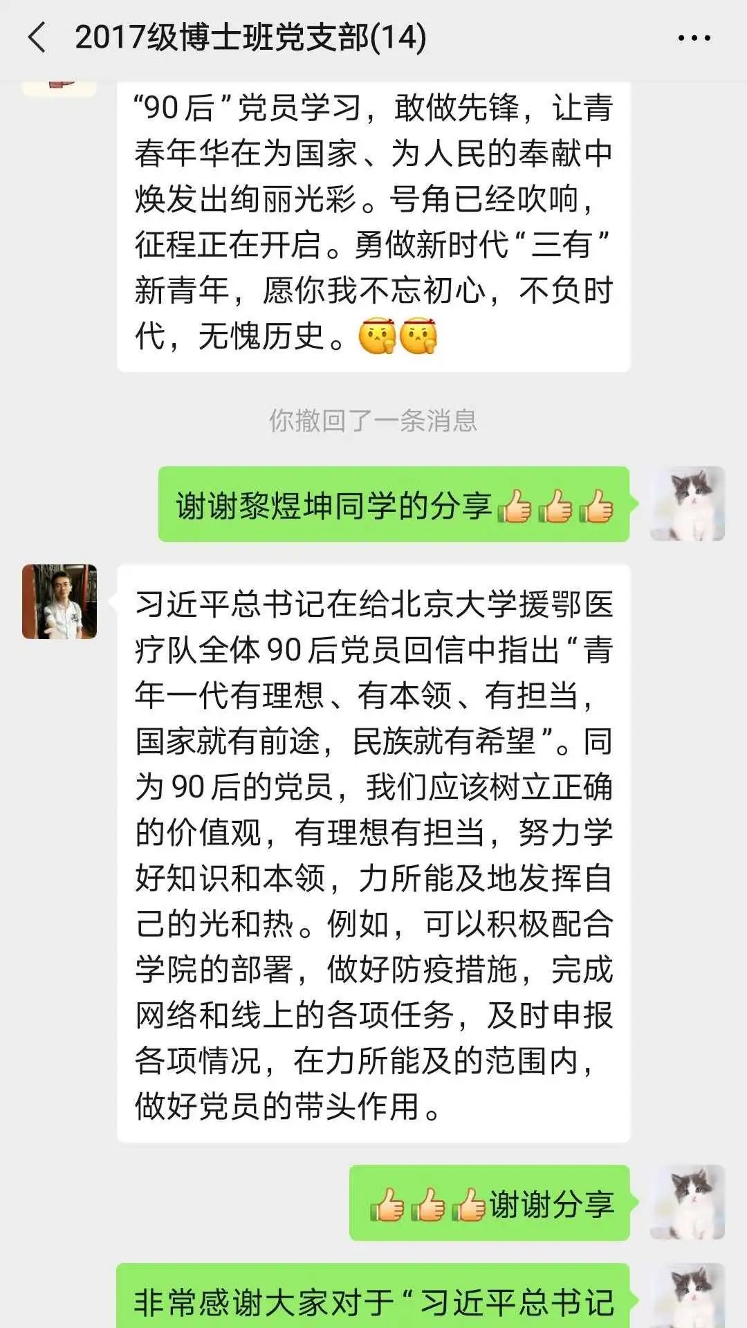 在这场人民战“疫”中,广大中国青年用实际行动证明,他们是有远大理想的一代,是有家国情怀的一代,更是能担当大任的一代。作为一名普通的青年党员,虽然我无法在抗疫一线战斗,但我也能做到不走动、不聚集、不信谣、不传谣,听党指挥,科学防疫。我们青年党员要继续认真学习习近平总书记重要指示精神,团结带领广大人民群众坚定不移把党中央决策部署落到实处,坚决打赢疫情防控阻击战!