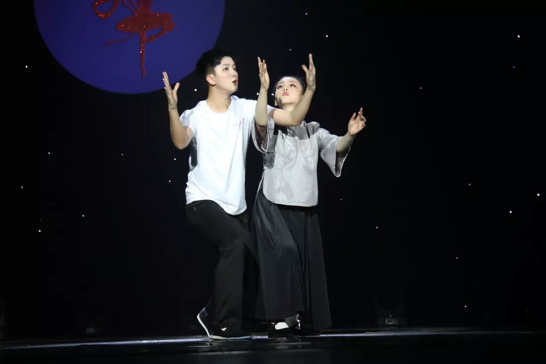 时光流转,百年前的热血一幕正缓缓落下。音调渐转柔和,只见百年前的灰衣少女伫立在舞台中央,新时代的白衣少年轻轻走近,他观察着、触摸着,试图唤醒当年的“五四”精神。转眼间,八组身影共同登场,灰者为昔,白者为今,今昔交叠,逐渐走向融合。