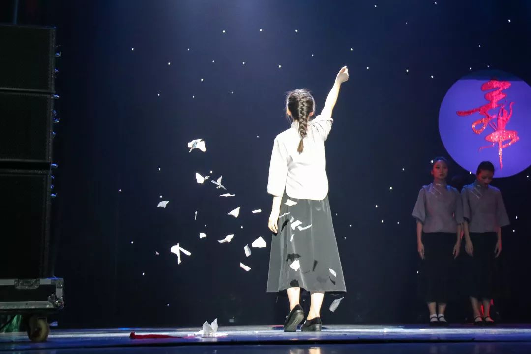 只见队员们汇聚成为一股洪流,他们冲破了过去与现在的阻碍,相隔百年却始终心心相印。一曲终了,灰衣少女将报纸的碎片一把撒向空中,撕碎了百年前的屈辱,当下之中国已不是百年前之中国,而1919的“五四”精神却将继续流淌在人们心中。