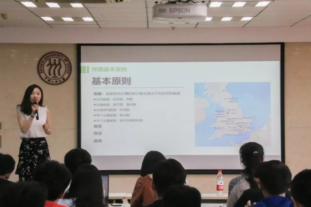 副教授黄丹阳为同学们带来了《简单的统计图——数据可视化专题讲座》。她从形式多样的统计图入手,从“明确数据类型、寻找合适工具”为切入点,介绍了数据可视化的具体步骤,阐述了以准确和美观为核心的绘图基本原则。她结合具体案例,从细节入手为同学们分析了常见统计图的利弊和适用范围。黄丹阳老师的细致讲解,不仅展示了统计之美,进一步激发了同学们学习热情和兴趣,并且为同学们随后的数据可视化大赛和日后的统计学习提供了必要的理论基础。