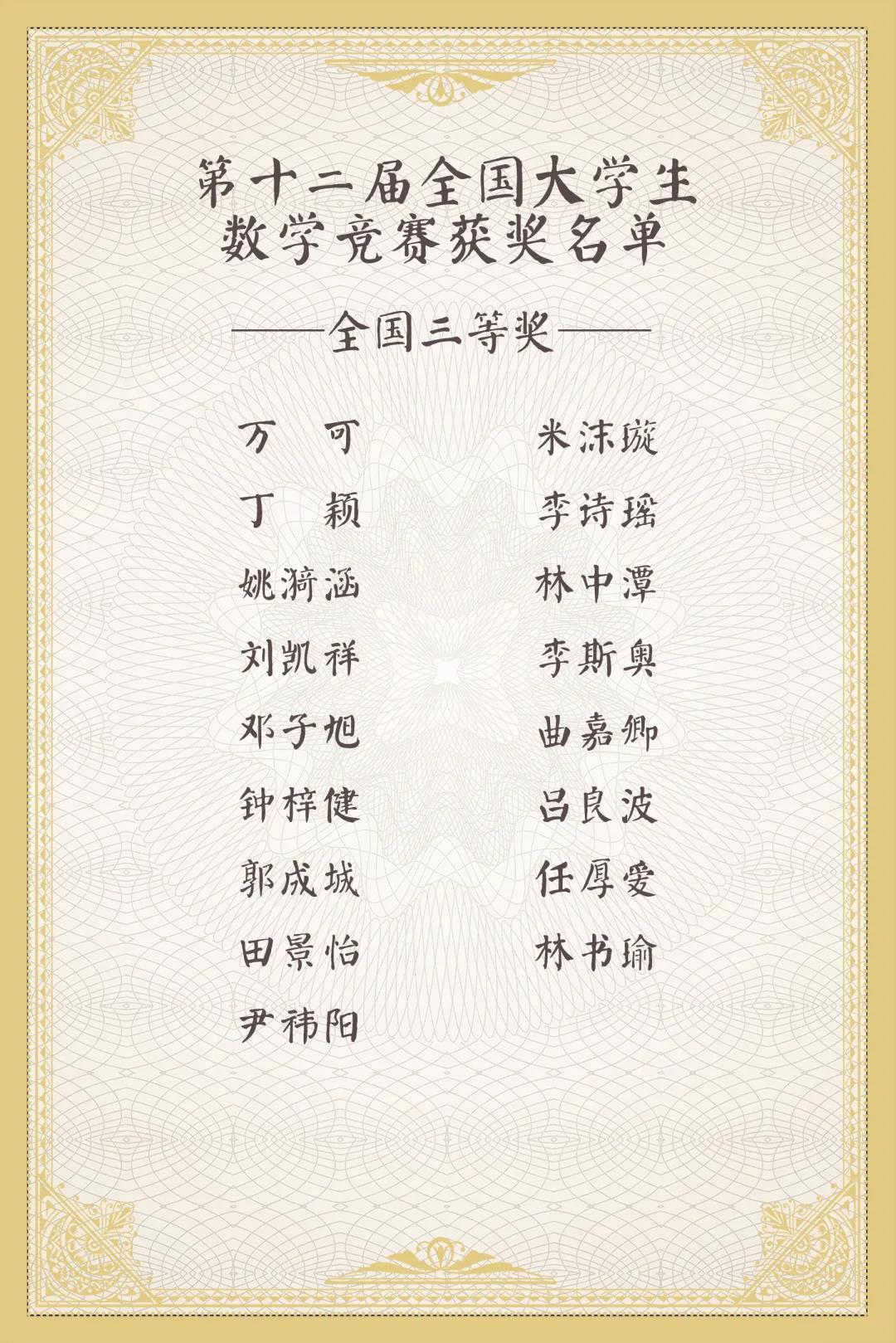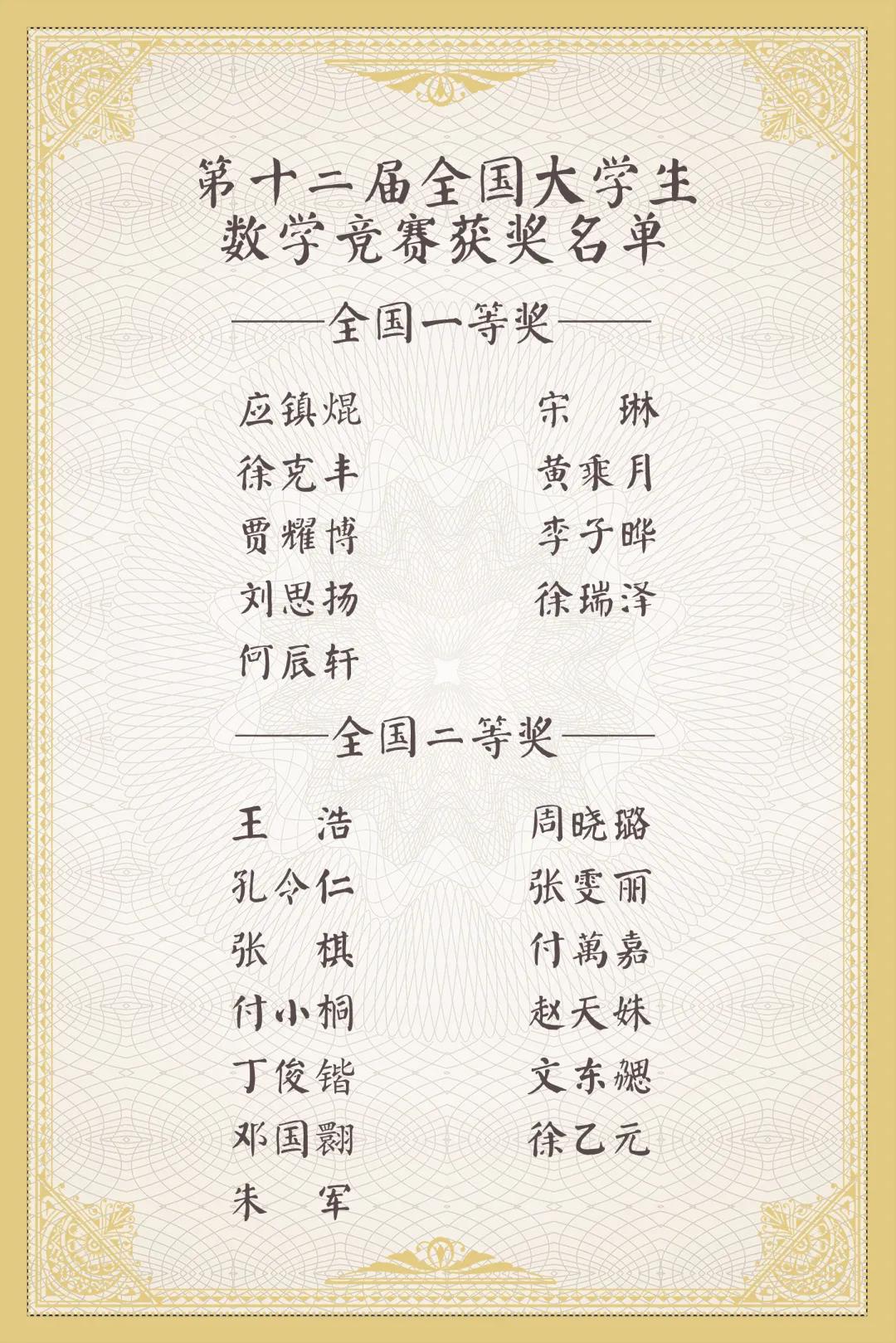 2020年第十二届全国老员工数学竞赛于近日揭晓成绩,统院学子在竞赛中表现优异,共有39位同学在本次竞赛中荣获奖项:其中9名同学获得全国一等奖,13名同学获得全国二等奖,17名同学获得全国三等奖,祝贺获奖的同学们。