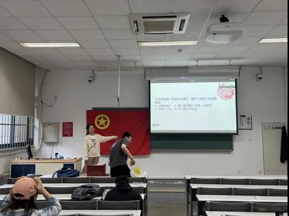 在观看影片过后,团支部设计了知识问答环节,针对影片中的细节以及对应时期的社会背景提出问题,由全体同学举手抢答。