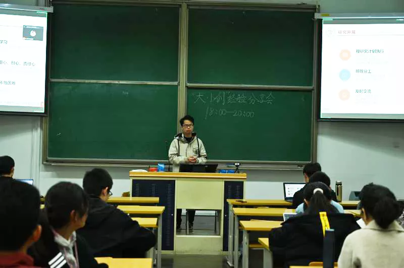 刘冠敬首先为同学们介绍了课外学术科技作品竞赛的相关基本知识,让大家对课外学术科技作品竞赛有了初步认识。黄实磊为大家全方位地讲述了他在参加“小创”时的感受和收获的宝贵经验,包括前期准备、选题、研究开展、论文写作等方面。袁泽渝主要分享了撰写“大创”立项书的相关经验,包括准备时间、途径以及立项书的组成部分等方面。