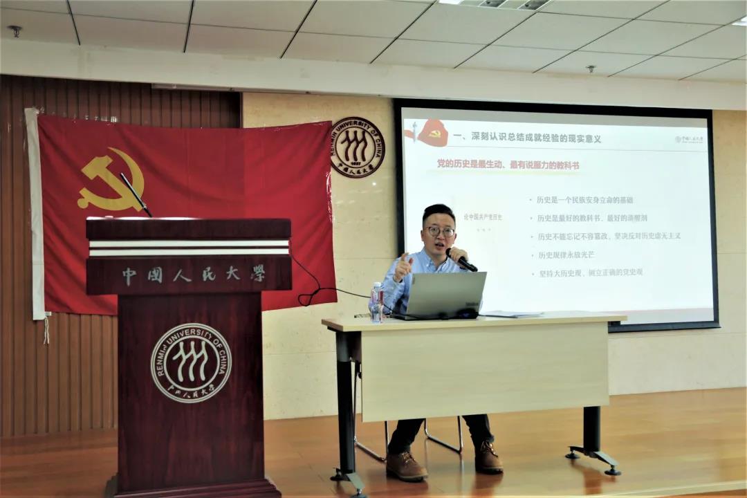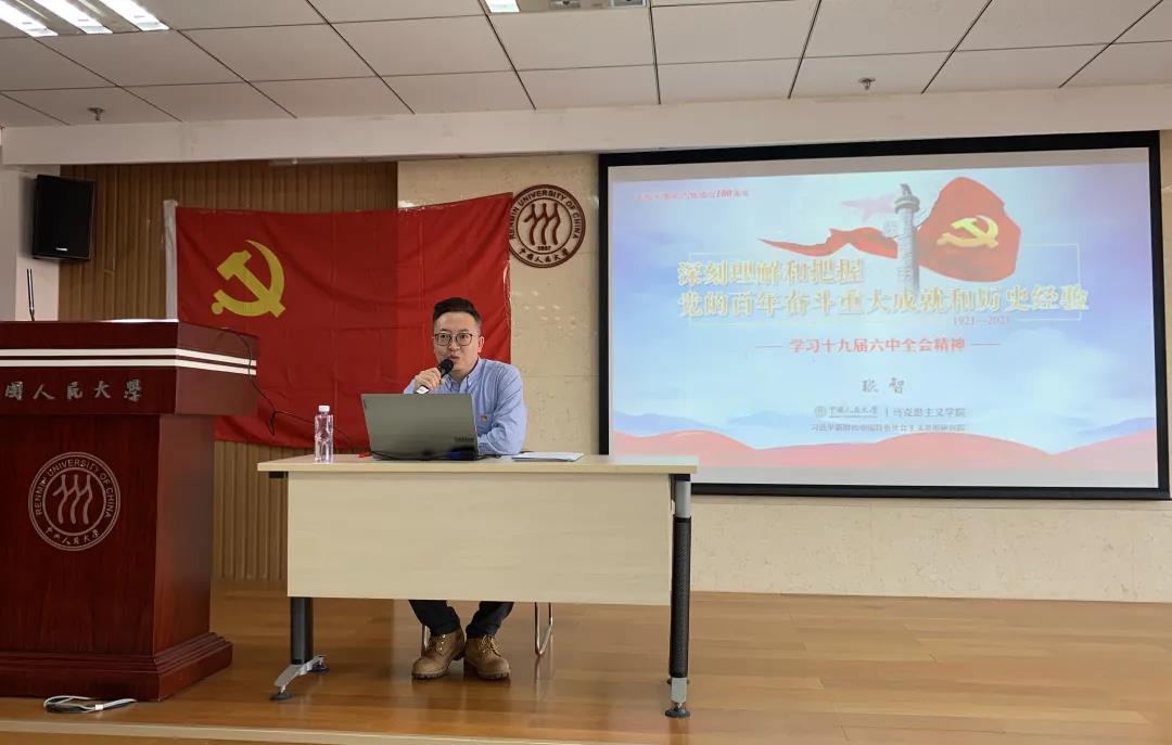 首先,张智从党史学习的必要性与中共党史上的“三个决议”等角度切入,引出总结党百年奋斗成就经验的现实意义。他强调“党的历史是最生动、最有说服力的教科书”,指出了党史学习的重要性,而在党史学习的过程中,我们应始终坚持大历史观,摒弃历史虚无主义,建立“长时段、宽视野、重规律”的学习视角。张智带领在场师生回顾了党史上的三个重大历史决议,指出重视对历史经验的总结与运用是党领导团结带领人民在百年奋斗历程中不断取得胜利的一个重要原因,并进一步指明深刻认识总结成就经验对于当下的现实意义。