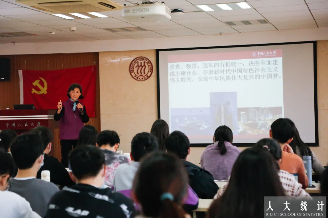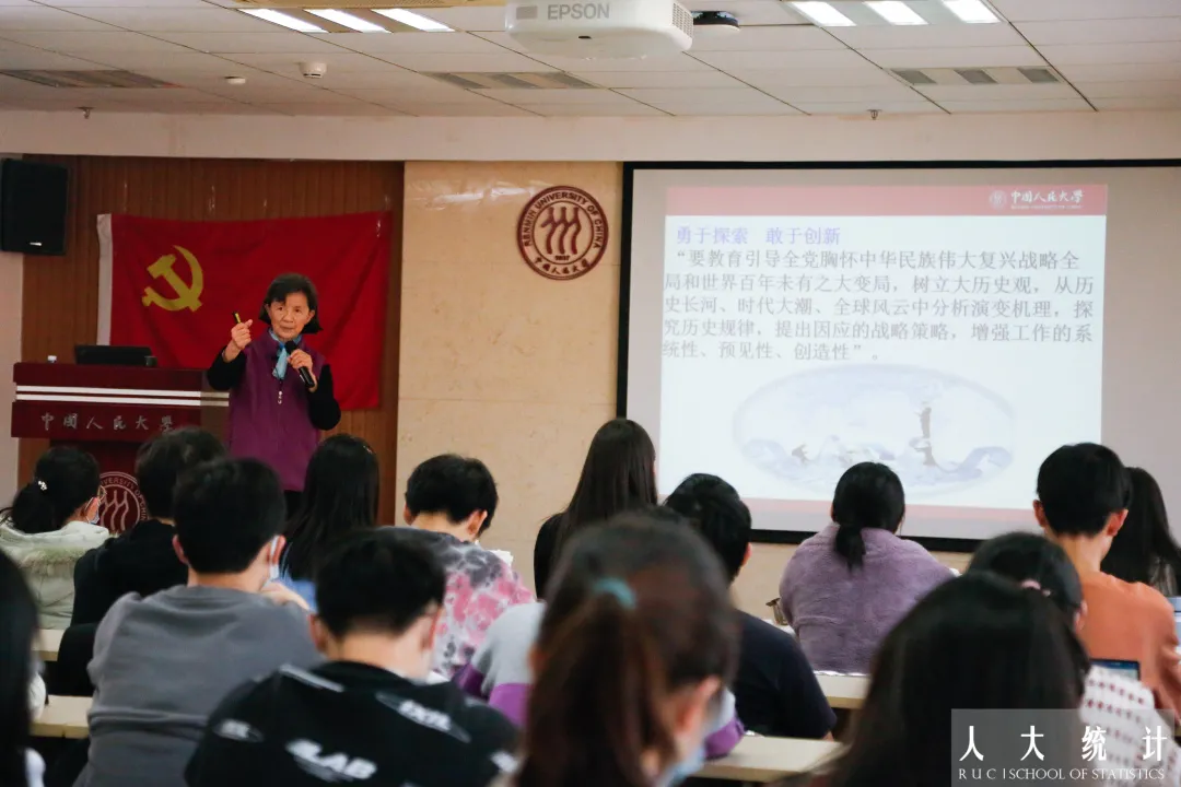 易丹辉从新征程的具体含义切入,将统计学子在实现第二个百年奋斗目标新征程中的责任与担当概括为四个方面,即坚定应对挑战的决心、鼓足应对挑战的勇气、铸就应对挑战的品格、提升应对挑战的能力。围绕这四个方面,她结合党的百年奋斗重大成就与统计学科特色,为全体学员进行了进一步的解读。