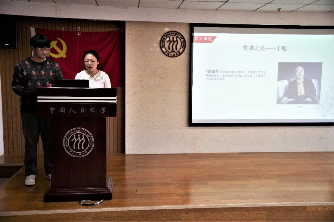 第三小组从一段短片切入,介绍了“两弹一星精神”。小组着重介绍了两弹元勋邓稼先、氢弹之父于敏、中国航天“大总师”孙家栋等精神楷模,强调了两弹一星精神中“自力更生,艰苦奋斗”“大方协同,勇于攀登”的精神内涵。