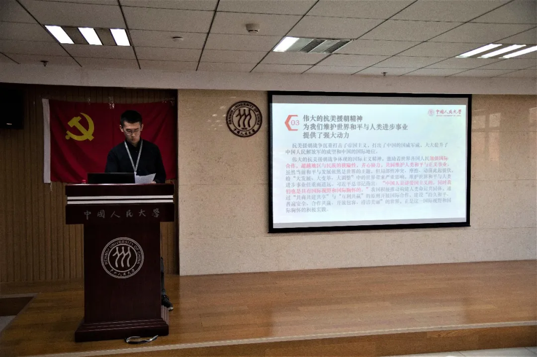 第六小组介绍了“抗美援朝精神”,从历史背景出发,介绍了黄继光、邱少云、杨根思等抗美援朝战斗英雄,生动阐释了抗美援朝精神中“爱国主义”“革命英雄主义”等重要内涵,号召全体学员悉心体悟抗美援朝精神的科学内涵和深厚意蕴。