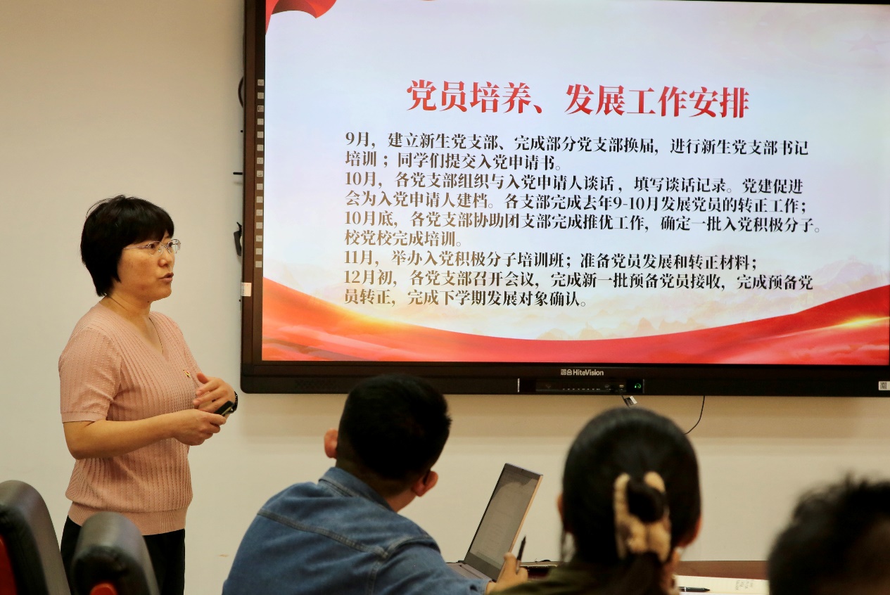 随后,徐建萍向员工党支书介绍了本学期员工党支部党员培养、发展及教育等工作安排。她表示,要严肃党员发展工作,丰富支部建设活动,希望各党支书能统筹协调,充分发挥主观能动性,高标准、高质量完成各项工作。