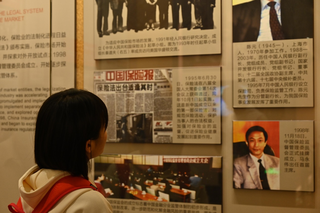 “红色保险史”展区展出了江西瑞金苏维埃的社会保险保单,以及党组织在抗战期间创办和领导保险企业的证明文件,这些均是民族保险业在党的领导下蓬勃发展的重要见证。讲解员介绍道,抗战时期,上海和重庆两地的保险公司作为地下组织为中国革命作出了重大贡献。以史为鉴、鉴往知来,展览如同一幅生动的历史画卷,鼓舞同学们汲取革命前辈的巨大精神力量,激励同学们作为新时代青年,不负青春韶华、勇于担当作为。