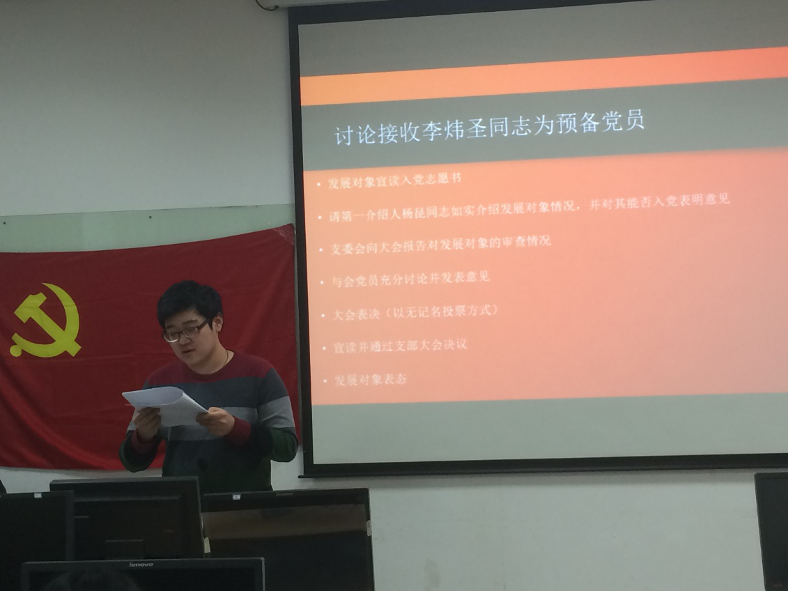 低年级本科生党支部依次对李炜圣、王品、陈嘉、林嘉欣、张心雨五名同学按照料流程分别讨论投票,最终支部全体党员一致同意接收李炜圣等5名同学为预备党员。党支部书记刘笑宣讲了支部大会决议。