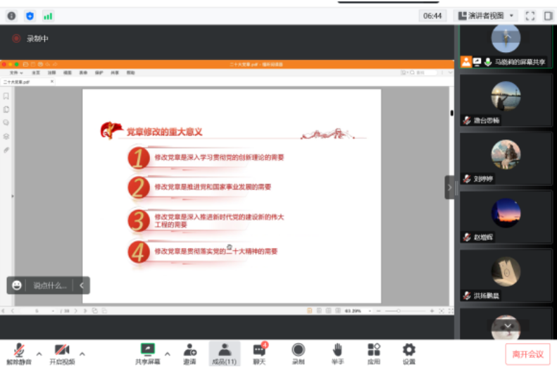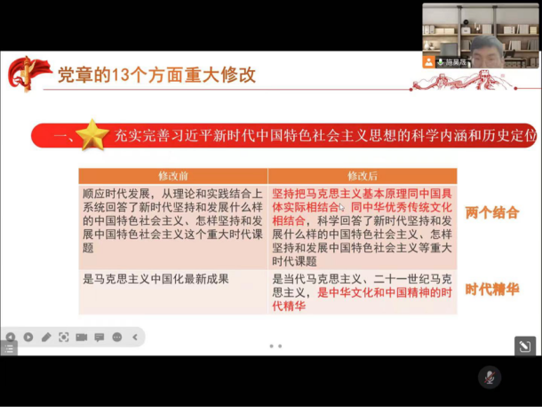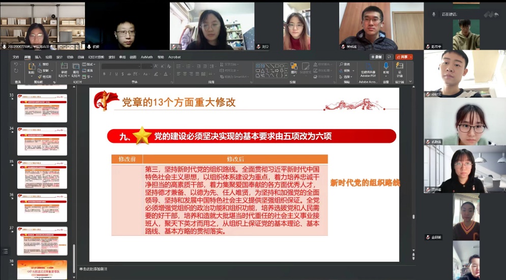 根据疫情防控要求,此次活动主要通过线上腾讯会议的形式开展。各党支部深入学习党章修正案,从不同角度切入,既从宏观上把握党章修改的依据与意义,又系统学习了党章修改的主要内容,进一步加深了对党章的理解。