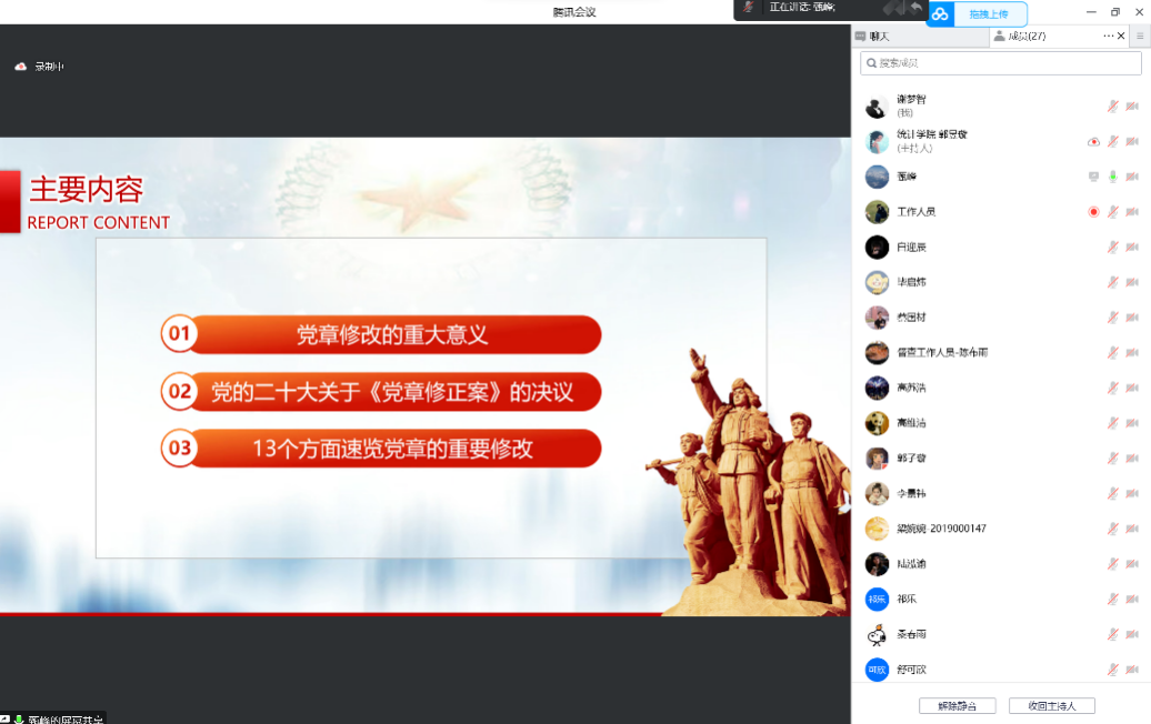 12月9日下午,2021级学硕党支部和统计与大数据研究院2020级研究生党支部联合开展主题党日活动,指导老师孟生旺为同学们介绍了党章修正的过程,强调要理解好党章修改的四个重大意义、明确好党章修改的六个重要部分,并对员工党员把握学习重点、联系个人发展提出了相关建议。