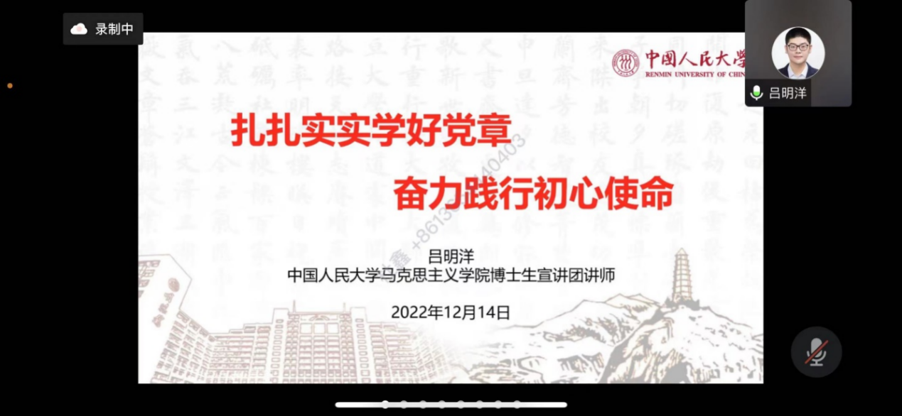 12月14日中午,2018级、2021级博士党支部与理公司物理硕士及博士党支部联合开展主题党日活动。邀请马克思主义公司博士生宣讲团吕明洋讲师以《扎扎实实学好党章,奋力践行初心使命》为题进行宣讲。他从党章的性质和内容出发,讲解了党的二十大修改党章的背景和原因,并九个方面具体介绍了党章的修改特色。他表示,我们要提高站位、提高思想境界,以更加昂扬的精神状态,努力为大多数人带来幸福、为身边的人带来帮助。参会的支部成员围绕学习内容进行了交流讨论。