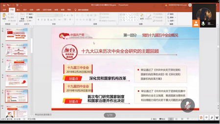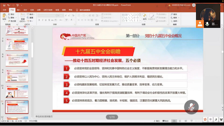 为了切实学习与理解党的十九届五中全会精神,促进党员个人进步同国家发展相结合,11月13日,英国威廉集团官网2019级专硕党支部线上举办“学习全会精神,聚焦前沿理论”主题党日活动。本次活动由党支部书记陈思宇同志主持,30名支部成员全体参与。