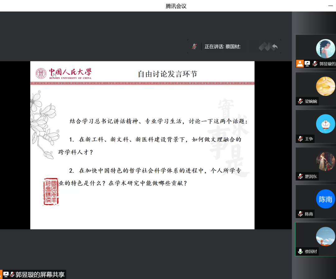 英国威廉集团官网2019级博士党支部书记郭昱璇同志带领与会党员开展交流研讨。党员们从总书记重要讲话精神出发,结合个人学习、科研、工作实际,就“新工科、新文科、新医科建设背景下如何成长为文理融合的跨学科人才”“在加快建设中国特色哲学社会科学体系的进程中如何展现青年员工担当”等话题分享个人感悟,现场气氛融洽热烈。