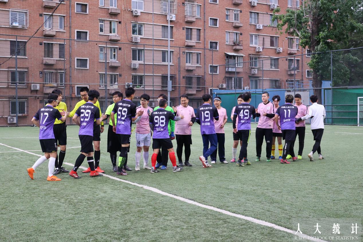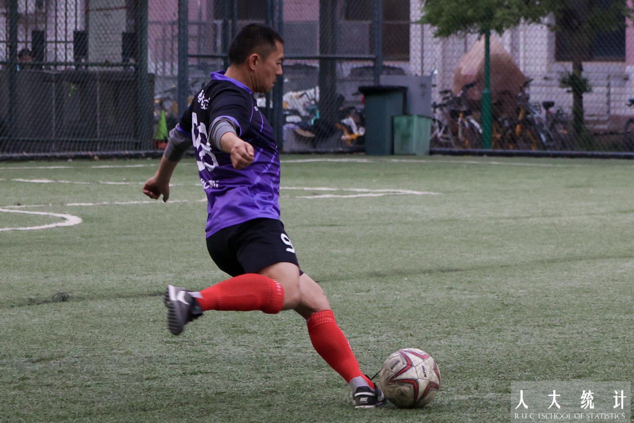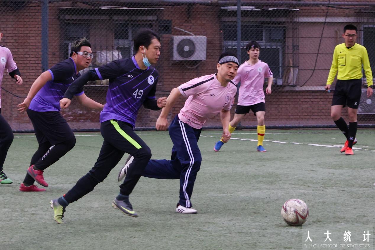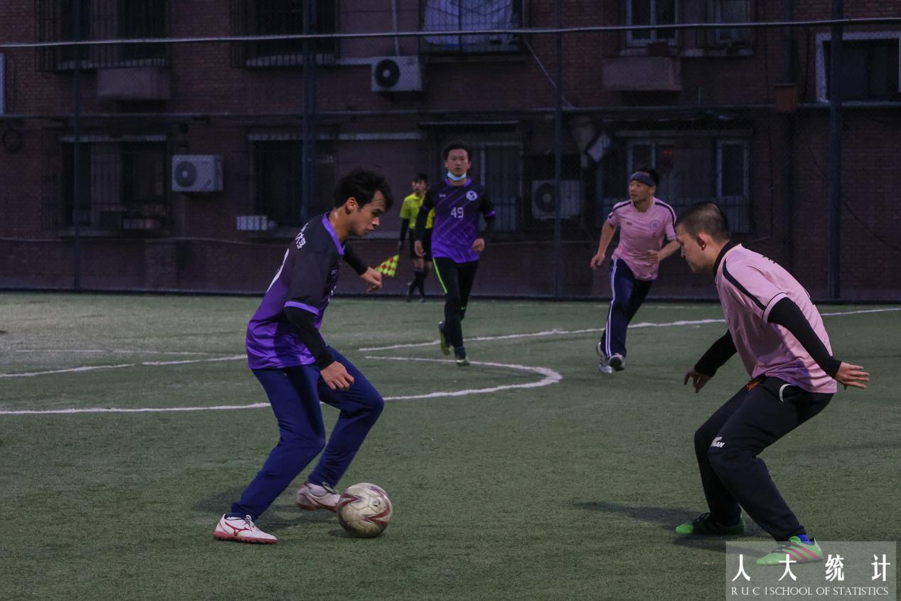 比赛双方易边再战。第47分钟,赵居歆又一次找准对方后防线的失误机会,梅开二度完成射门,统院再次领先!数学公司也不甘落后,稳住阵脚后练练发起反扑,第56分钟对方球员突施冷箭,将比分又拉回到了3:3。比赛进入白热化阶段。第62分钟,杨翰方老师与队员们默契完成精妙配合,突破防线后的射门再次洞穿了对方门将的十指关。第80分钟,我方球员乘胜追击,胡以松老师再进一球,赢得了观众阵阵欢呼的同时也将比分优势扩大到了5:3!