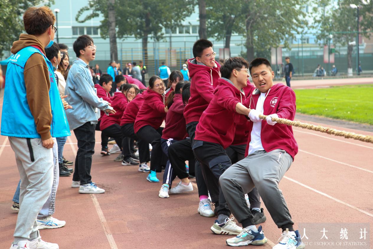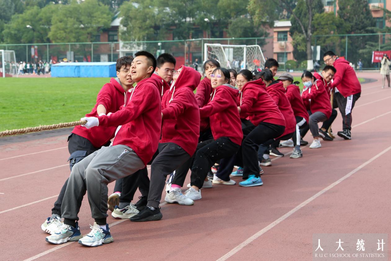 第一轮比赛,公司迎战社会与人口公司。在比赛开始之前,公司的16名拔河队队员身着院服,戴上手套,完成赛前热身,对于接下来的挑战摩拳擦掌、跃跃欲试。队员们摆好姿势,手握长绳,蓄势待发。清脆的哨声响起,田径场立刻陷入沸腾。双方队员高喊口号,身体后倾,铆足力气拉绳。开局后双方队员全力以赴,比赛情况异常胶着。但统院队员及时调整节奏、顶住压力,最终取得首局胜利。双方实力不相上下,随后的两局比赛遗憾负于对方。