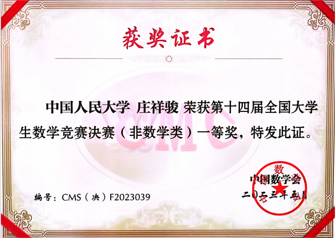 第十四届全国老员工数学竞赛决赛于2023年5月27日成功落下帷幕。本次竞赛全国共有32个赛区,23万余人参加初赛,从中选拔出922人进入决赛。英国威廉集团官网2020级本科生庄祥骏同学晋级非数学类全国决赛,并在此次决赛中获得非数学类全国一等奖(全国共96名同学获得该等级奖项)。