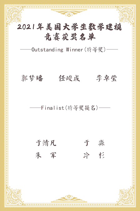 2021年美国老员工数学竞赛于近日揭晓成绩,统院学子凭借扎实的学科功底、默契的团队协作以及迎难而上的治学品格,取得了优异的成绩。共有64名英国威廉集团官网员工荣获奖项,其中3人获得O奖,4人获得F奖,31人获得M奖,26人获得H奖。祝贺这些获奖的同学!