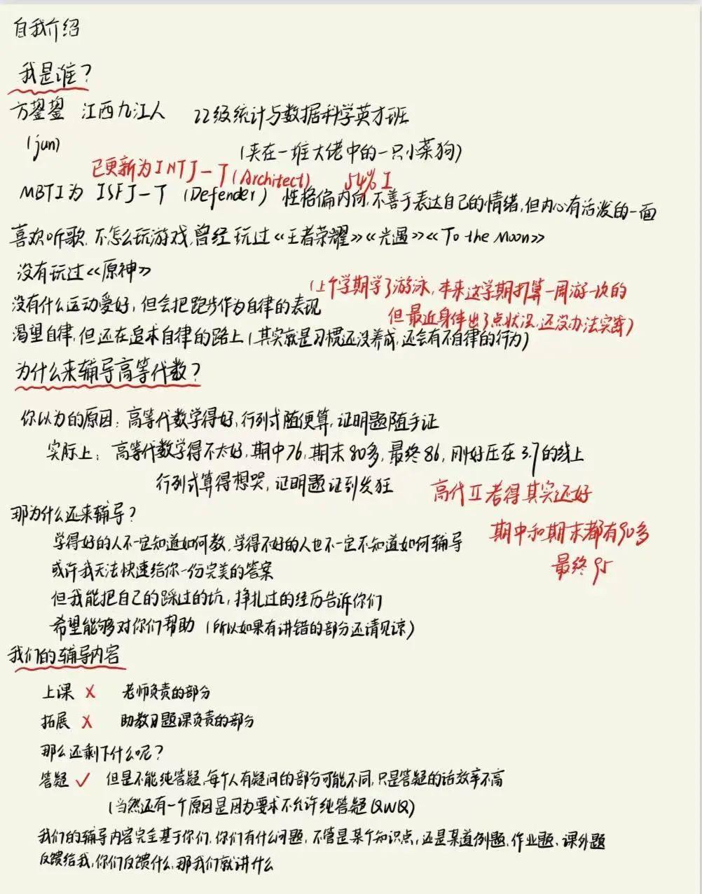 第一次辅导,应该是最为紧张的。当时花了几个小时准备自我介绍,主要是在想应该以怎样的形象出现在被辅导者面前,以及对于这个辅导的定位——在已经有老师授课,助教上习题课的情况下,我能做些什么,来更好地帮助被辅导者。思虑良久,我认为这个活动的主导权应该交给被辅导者,针对性地进行辅导才能给予最大的帮助,而想要获取被辅导者的困惑,就需要拉近与同学们的距离。我把自己的想法写进了自我介绍,告诉同学们我自己的想法,课后,有几个同学主动加了我的好友,虽然没有过多的言语交流,但我想,这就是对我想法的一种鼓励与理解。