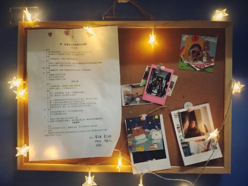 美不自美,因人而彰,在品六307成员的齐心建设下,塑造了307“活泼里不缺沉稳,笑闹中不乏关爱”的宿舍氛围。307宿舍成员为宿舍日常绘画了可爱生动的漫画、设计了专属于307的宿舍LOGO。除此以外,品六307宿舍还有着独特的宿舍文化。在307进门左手边的风采展示板上,有着她们共同签下的宿舍合约,还有她们的数张合照。