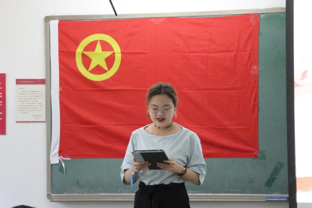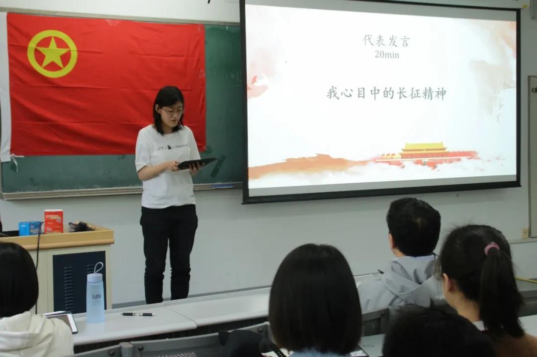 戴雨辰同学结合毛泽东诗词《忆秦娥·娄山关》中蕴含的长征精神谈感想。她表示,虽然我们处于和平年代,但是复杂多变的国际形势同样在考验着我们每一位党员的理想信念。我们要不忘初心,始终把全国人民和中华民族的根本利益看得高于一切。