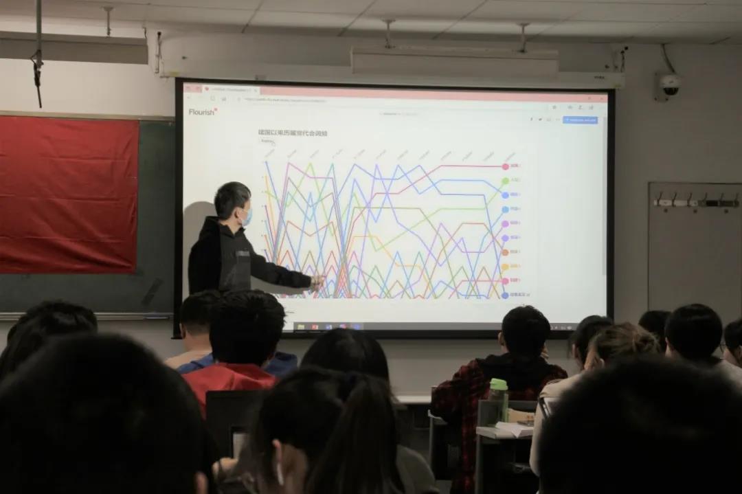 “大数据看党史”作品展示环节中,三名同学的大数据作品分阶段、图文并茂地回顾了中国共产党百年来的光辉历程。