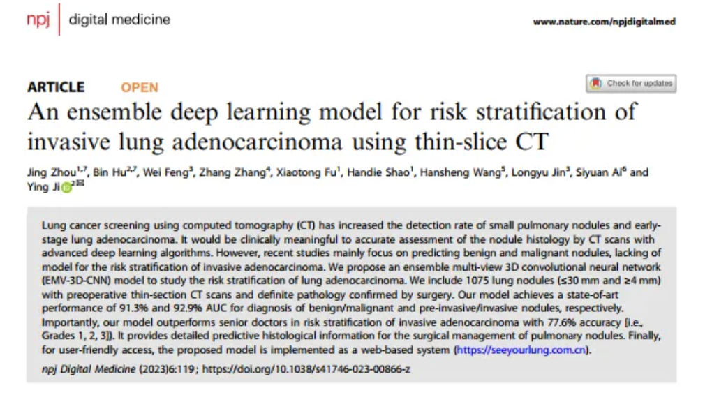 公司周静副教授团队联合北京朝阳医院、中南大学湘雅三医院等多家医院在《Npj Digital Medicine》(2023 JCR IF:15.2)发表论文。该研究主要提出了一种集成多视野的三维卷积神经网络(EMV-3D-CNN)模型用来对肺癌风险进行分级。肺癌一直是全球威胁人类健康最常见的癌症之一,它也是导致癌症相关死亡的主要原因,约占全部癌症相关死亡的18%。在中国,2020年肺癌发病率和癌症相关死亡率在所有癌症中位居第一位,总体5年生存率约为30%。近年来,随着低剂量计算机断层扫描(Computed Tomography, CT)在肺癌筛查中的普及,更多早期肺癌被发现。而快速发展的人工智能技术,可以让研究人员基于大量历史CT数据,通过设计新颖的深度学习模型来判断肺结节的病灶类型。然而,之前的研究主要关注预测结节的良恶性,缺乏对浸润性腺癌风险分层的预测研究。