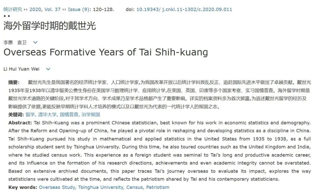 Tai Shih-Kuang was a prominent Chinese statistician, best known for his work in economic statistics and demography. After the Reform and Opening-up of China, he played a pivotal role in reshaping and developing statistics as a discipline in China. Tai Shih-Kuang pursued his study in mathematical and applied statistics in the United States from 1935 to 1938, as a full scholarship student sent by Tsinghua University. During this time, he also toured countries such as the United Kingdom and India, where he studied census work. This experience as a foreign student was seminal to Tai’s long and productive academic career, and its influence on the formation of his research directions, achievements and even academic integrity cannot be overstated. Based on extensive archived documents, this paper traces Tai’s journey overseas to evaluate its impact, explores the way statisticians were cultivated at the time, and reflects the patriotism shared by Tai and his contemporary statisticians.