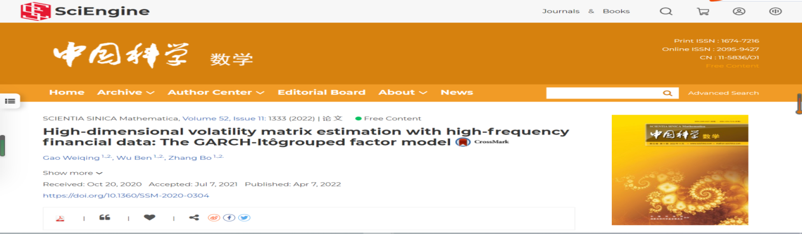 公司张波、吴奔老师在《中国科学:数学》发表论文。该研究主要探讨了金融资产存在自然的分组结构时的高维波动率矩阵的估计和预测问题。研究中提出了一种全新的GARCH-It分组因子模型,该模型将对数价格序列表示为共同因子、分组因子以及异质项, 并通过将离散的GARCH 结构嵌入特征值过程的波动率中, 实现刻画数据波动率动态的目的,该模型同时提升了资产配置中波动率矩阵的预测效果。