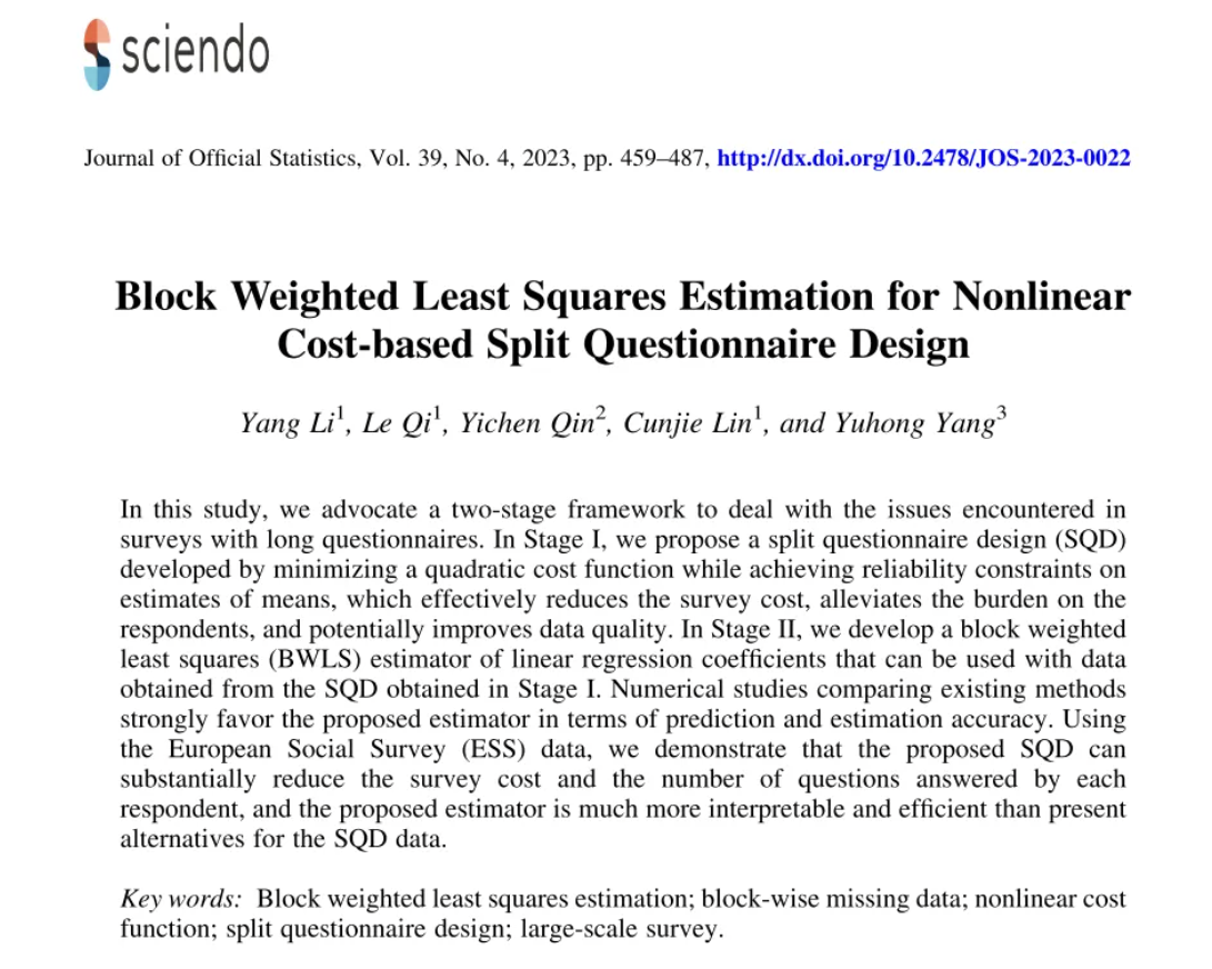 公司李扬教授等在国际政府统计期刊《Journal of Official Statistics》发表论文,就大规模调查中的问卷分割设计技术以及数据建模分析方法展开研究。在信息时代,大规模调查被广泛应用于社会学研究、政府统计、经济决策和市场调研等诸多领域。然而,问卷长度的增加导致受访者负担加重、拒访率增加,从而引起调查工作执行难度加大、调查成本升高以及数据质量下滑等问题。本研究提出一种基于优化非线性成本函数的矩阵采样技术,实现大规模长问卷的分割设计,该方法能够有效较低调查成本和受访者负担,达到降低拒访率、提升数据质量的效果。研究者针对问卷分割设计所得到的分块缺失数据提出线性回归模型的加权最小二乘估计,在估计和预测的准确性方面均具有明显优势。