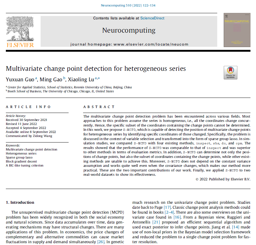 论文摘要:The multivariate change point detection problem has been encountered across various fields. Most approaches to this problem assume the series is homogeneous, i.e., all the coordinates change concurrently. Hence, the specific subset of the coordinates containing the change points cannot be determined. In this work, we propose S-MCPD, which is capable of detecting the position of multivariate change points for heterogeneous series by identifying specific coordinates of those changed. Specifically, the problem is discussed in the context of variable selection and transformed into the form of sparse group lasso. In simulation studies, we compared S-MCPD with four existing methods, inspect, sbs, dc, and cpm. The results showed that the performance of S-MCPD was comparable to that of inspect and was superior to other methods in terms of evaluation metrics. In addition, S-MCPD can determine not only the positions of change points, but also the subset of coordinates containing the change points, while other existing methods are unable to achieve this. Moreover, S-MCPD does not depend on the constant variance assumption and works quite well even when the covariance changes, which makes our method more practical. These are the two important contributions of our work. Finally, we applied S-MCPD to two real-world datasets to show its effectiveness.