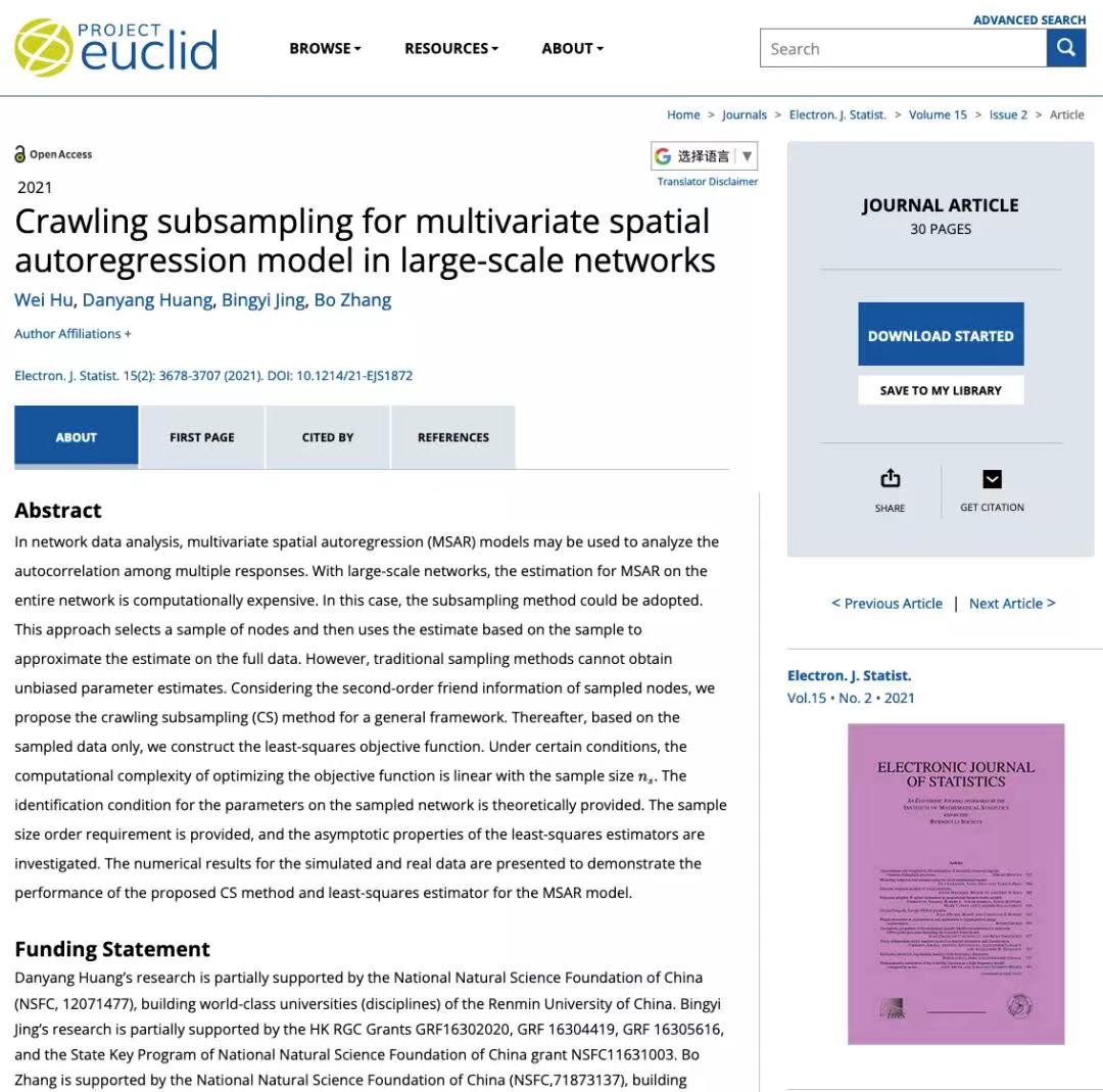 公司在读博士生胡威在《Electronic Journal of Statistics》发表论文。该研究主要针对大规模网络数据,提出了一种爬取式采样的方法,能够对多元空间自回归模型得到参数的一致估计,并给出了相应的理论性质。从而解决了以往采样方法得到的样本数据下,无法对该类模型得到一致估计的问题。