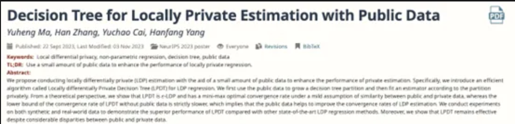 公司员工马宇恒、张涵与杨翰方教授在NeurIPS2023发表论文,提出了使用公开数据辅助局部差分隐私学习。针对非参数回归问题,文章从理论与实验两个角度研究了公开数据带来的优势。