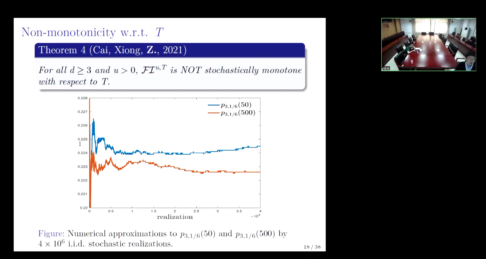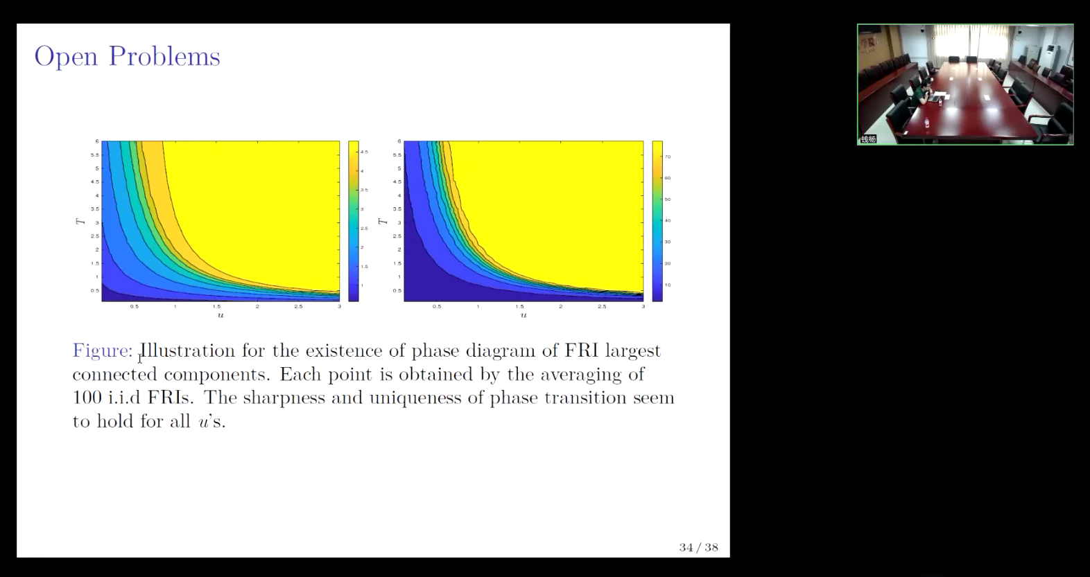 接下来,张原着重讲解了强度参数u固定,轨道长度参数T可变的情况,运用Liggett-Schonmann-Stacey构造、随机重整化、以及随机增长算法的方法去探究u和T对于全局的影响,进而证明高维度下强度参数u与轨道长度参数T成反比和低维度下呈幂函数关系的观点。