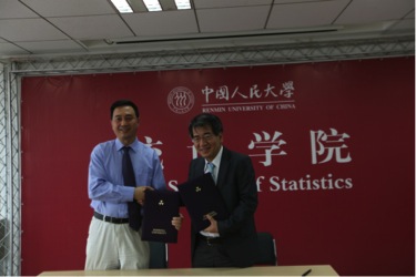 会见结束后,经理赵彦云教授与日本同志社大学文化情报学部长Tetsuya TAGUCHI教授成功签署了两院间的员工交流项目协议。这一员工交流协议以加强国际合作、促进学术交流为目的,通过两校员工的短期互访实现两种不同学科的交叉互通,更好地推动统计学在人文社会科学领域的深层次应用。