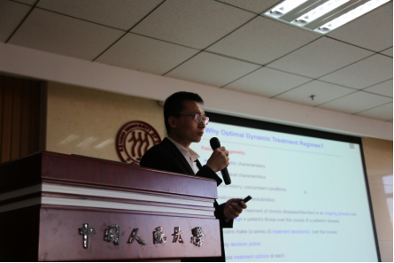 张拔群博士的报告题目是:C-learning: a New Classification Framework to Estimate Optimal Dynamic Treatment Regimes. 精准医疗是目前生物统计领域研究的热点问题,其主要目的是针对每个病人,根据病人特征帮助其在每个时间点选择治疗方案,从而最大化最终的治疗效果。张拔群博士提出的C-learning的方法与已有方法相比,有两个特点。第一是借鉴缺失数据中的逆概率加权方法最小化一个加权的错分误差函数,估计最优决策函数。第二是先估计出后一期的最优决策函数,根据后一期的信息逐步寻找前一期的最优决策,这是一个动态规划的过程。该方法的有效性可以通过大量的模拟验证。在报告中,在场师生就对病人的细分程度、疗效的评价标准等问题与张拔群博士进行了讨论。