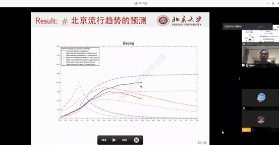 周晓华首先指出,在当下大家看到的大量关于新冠病毒的新闻报道和医学研究背后,统计方法和数学方法发挥着很大的作用。围绕“新型冠状病毒(COVID-19)的潜伏期分布估计和流行趋势预测”的主题,他分别就以下四个方面进行了分析:武汉市COVID-19病例总数的估计、时变再生数(time-varying reproduction number)的估计、潜伏期分布的估计和基于新随机动态模型的中国COVID-19爆发预测。关于模型的使用,他指出了最传统也最经典的SIR模型的缺陷,即由于没有考虑到潜伏期,SIR模型不适用于新冠病毒的研究,现在应用于新冠病毒研究的主要是基于SIR模型的修改或拓展。他还介绍了一种新随机动态模型——SEAQIR模型,这个模型将人群分为易感人群、暴露组、隔离组、感染组、治愈人群和死亡,并且在每个组内对人群做了更细致的分类。在此基础上,研究团队对收集的1月22日至2月21日的每日确诊、出院人数的数据使用新随机动态模型进行分析,周晓华讲解了研究所得的关于新冠病毒流行趋势的结论。讲座最后,他用文字、图表等多种形式对北京地区新冠病毒的流行趋势做出了预测。