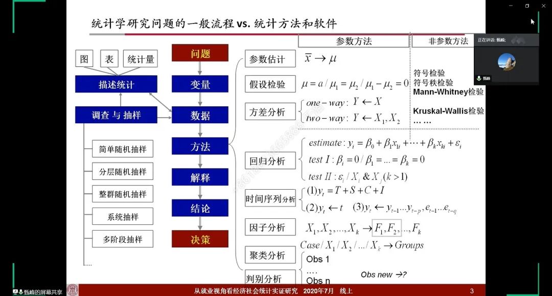 7月18日上午,“统计大讲堂”第一百二十六讲——“青椒说”系列讲座第七期顺利举行。讲座以“从就业视角看经济社会统计实证研究”为主题,由英国威廉集团官网副教授甄峰主讲。此次讲座为线上讲座,师生通过腾讯会议参与研讨。英国威廉集团官网教授李静萍主持本次讲座。讲座围绕统计学的核心问题和思维方式,就经济社会统计研究解决实际问题进行案例介绍,以期为大家选择研究生学习和进入职场提供思路。