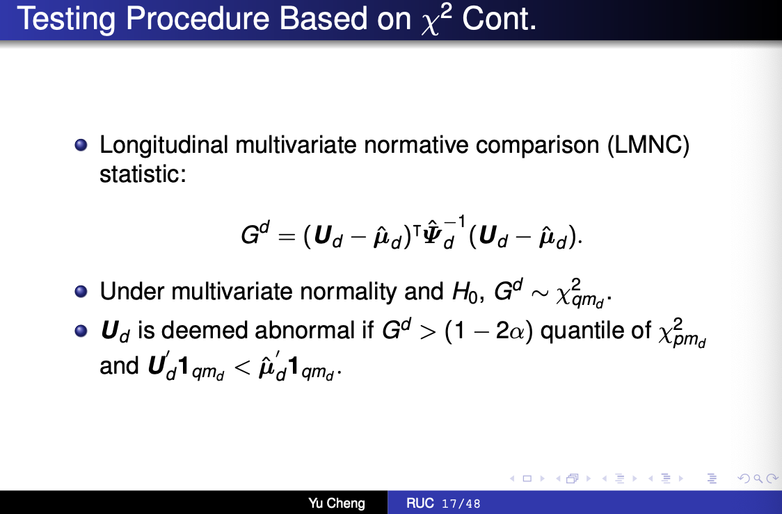 成玉首先从一个多中心队列研究出发,指出认知障碍的临床诊断通常基于6项神经生理学评分,并介绍了经典的Multivariate Normative Comparisons(MNC)分类方法。该方法通过构建检验统计量对认知障碍进行分类,同时考虑6项评分之间的关联性,从而可以有效控制familywise error rate(FWER)。然而,该方法只适用于简单的截面数据,没有考虑到纵向数据中多次随访间的关联性,因此可能导致type I error inflation。此外,针对正在开展中的队列研究,由于未来随访次数具有不确定性,研究者还需要考虑如何在随访过程中动态诊断认知障碍,同时有效控制FWER。因此,成玉团队提出了新颖的基于MNC的动态损伤分类方法。