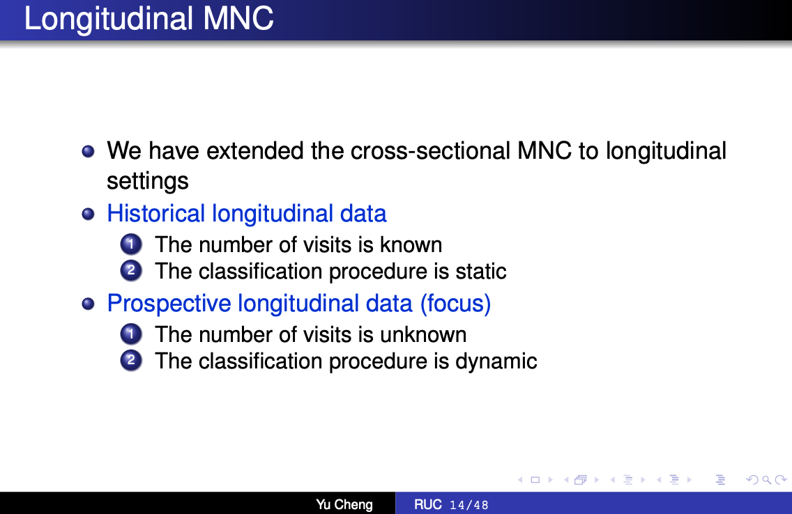 接下来,针对随访次数已知的历史纵向数据,成玉提出了新的Longitudinal MNC(LMNC)方法,将传统MNC的横向设置扩展到了纵向设置,并介绍了新设置下的检验过程。