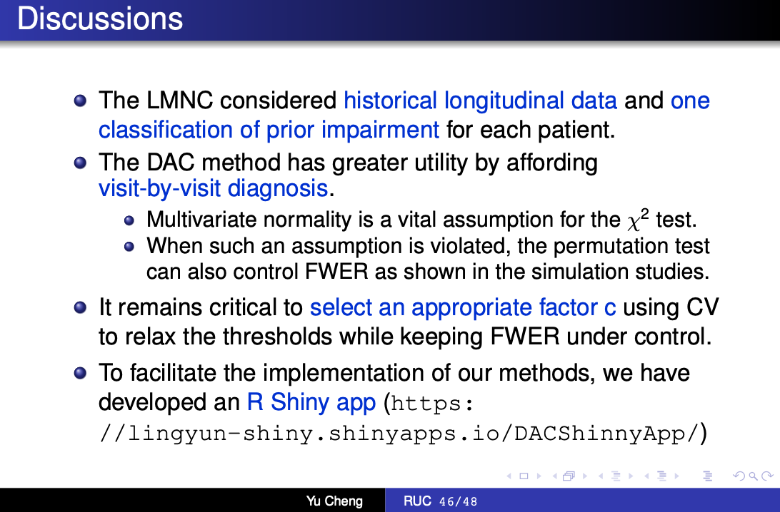 继而,针对随访次数未知的进展中纵向研究,成玉介绍了动态排列比较方法(Dynamic Arrayed Comparison,DAC)。该方法在LMNC的基础之上,使用双模型法从历史纵向数据中估计未来随访次数,并证明了检验统计量服从卡方分布,同时能够很好的控制FWER。此外,针对真实数据不服从正态分布的情况,成玉提出了一套新的permutation test算法,并在数值模拟中验证了该算法的稳定性与有效性。最终,成玉将新方法应用于一项大规模多中心队列研究,取得了优秀的分类效果。该方法的代码已于Shiny平台公开,供广大研究者使用。