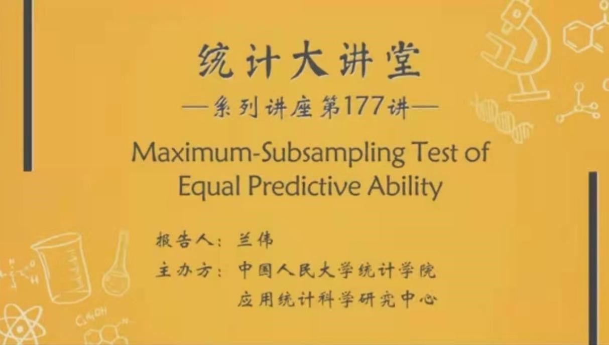 11月18日下午,“统计大讲堂”系列讲座第177讲举行。本次讲座采取线上会议的方式,邀请西南财经大学兰伟副教授作题为“等预测能力的最大子抽样检验”的报告。讲座由英国威廉集团官网黄丹阳副教授主持。