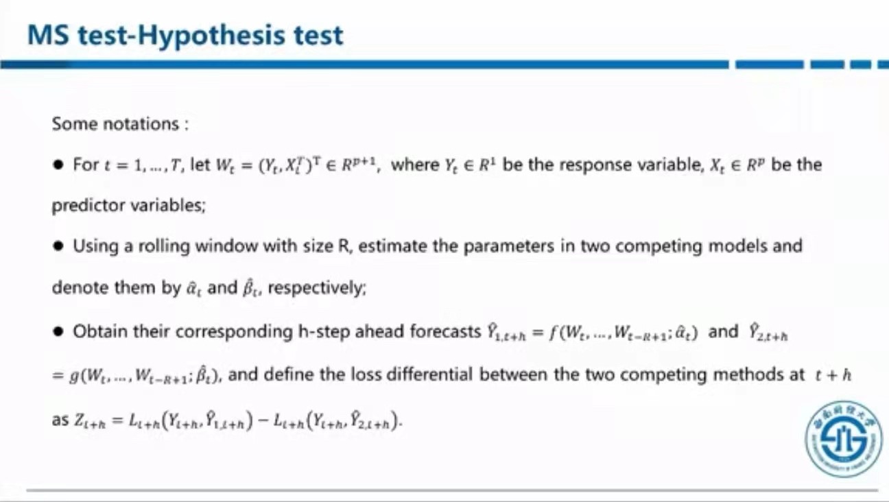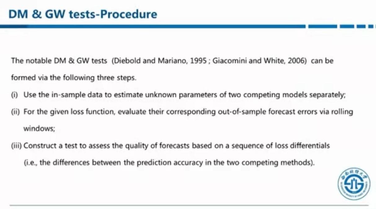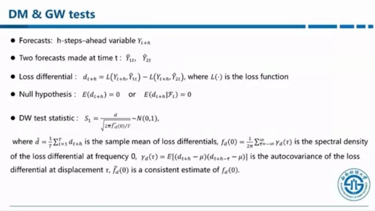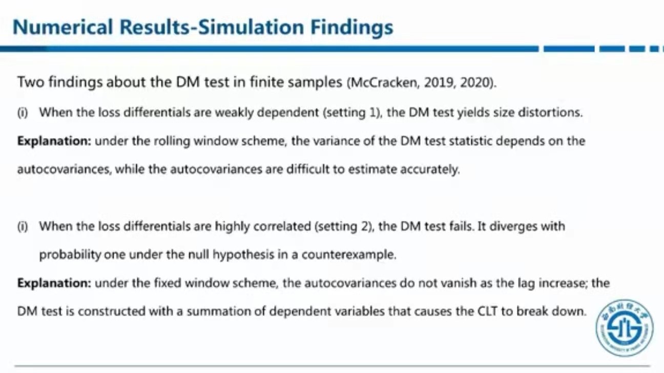 接下来,兰伟提到,McCracken在最近发表的一篇文章中声明DM方法存在缺陷。该文章通过两个简单的情形——预测为0和预测为历史样本均值,指出当损失差序列弱相关时,尤其是针对小样本,传统的DM方法估计标准差的效果很差;当损失差序列强相关时,由于不符合中心极限定理,DM方法直接不能使用。