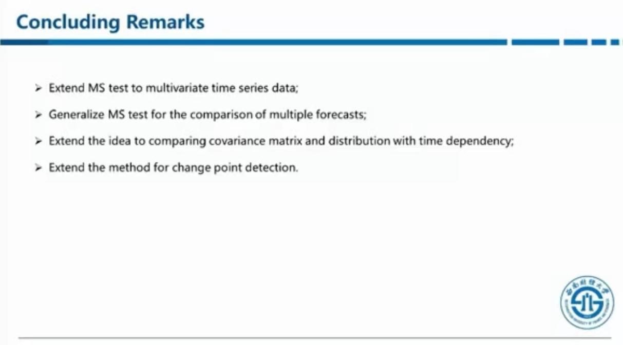 最后,兰伟对报告内容进行了总结,并对MS方法作了进一步的评价。他指出,MS方法不仅可用于上述问题的检验,也可推广到其他应用场景,如多维神经序列的构建,多个预测方法的比较,不同的协方差矩阵的比较和时间变点的检测等。